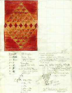 a presentation that I’m involved with, so thought I’d post them. The first two involve doing gradations of color, so in order to know how big each section needs to be, I would label each grouping of yarn and do calculations. The bottom piece never got photographed before it went to its happy new home. Oh, well … Next to the last drawing is the real photo of what the first two drawings ended up looking like.