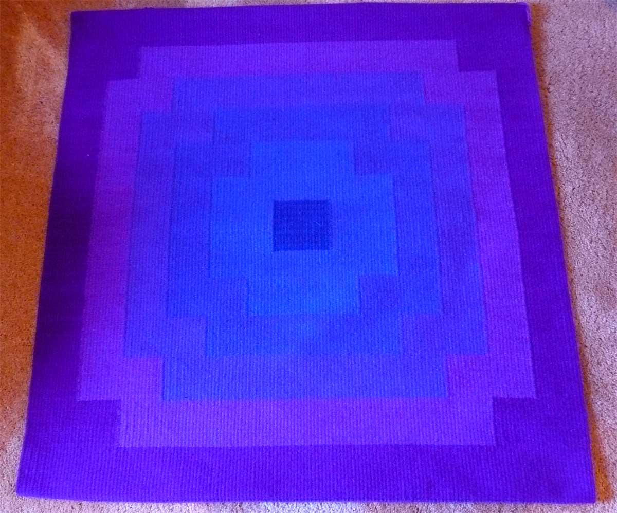 Okay, as usual, the picture isn’t great. This is the one that has just been cut off the loom. And, as usual, the colors are not quite right. Oh, well, I’ll try to get a “real” photo taken next week. But, you know, it is the holiday season and other things may have to take precedent. Like visiting with my son and daughter-in-law next week. They will be arriving on Monday, so maybe a little extra housework is in order. As I have been weaving I worried that the color gradations might be too subtle (and they are more subtle than this picture shows). But when I look at it laying on the floor, the gradations look good. I don’t have the final measurements yet, but the width is about 38.5 inches. If plans had worked as planned, it would be square, but I don’t think it is.